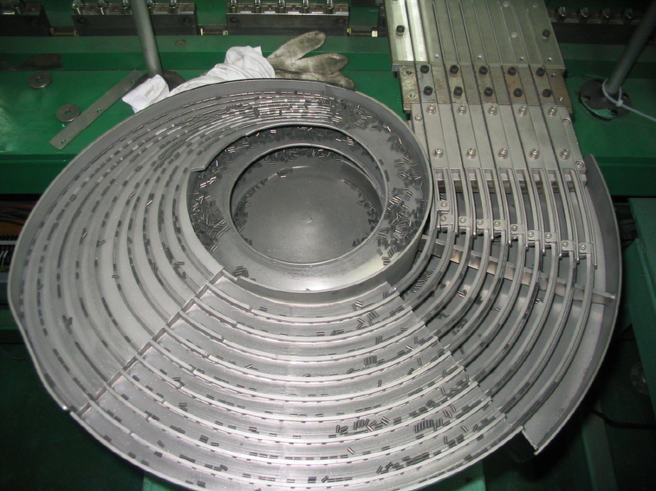 볼(bowl)경은 Ø150 의 소형 부품 공급장치로부터 Ø2500의 대형 볼까지 제작되며, 계단식, 원추식, 원통식, 접시식 등의 방식이 있다. B/F는 부품의 형상 및 특성에 따라서 Attachment를 이용하여 정렬 공급하고 Attachment 로 선별이 불가능할 경우 Sensor를 응용한 정렬방식이 있다 B/F는 일반적으로 그림 1과 같은 형상과 구조되어 있으며 부품의 형상과 특성에 따라서 제작하여 사용할 수 있으며 볼의 종류는 그림 2와 같이 3가지 종류를 주로 사용하고 있다. 그림 1은 볼 피더(Bowl Feeder)의 외형구조이며, B/F의 Vibrator 에 사용하고 있는 스프링의 상부 진동판과 하부 고정판 결합부위의 경사각은 일반적으로 국내에서는 20˚를 이상적으로 사용하고 사양에 따라 10˚-30˚의 경사각을 사용하고 있으며, 스프링을 결합하여 진동Core에 의해 중심축으로 회전하는 나선형 진동을 하게 되며, 그림 4, 그림 5 와 같이 스프링의 각도 방향에 따라 시계방향(C.W)과 반시계방향 (C.C.W)으로 방향이 결정된다. 이와 같은 동작을 매 초 반복함에 따라서 마치 전체가 올라가는 것처럼 보이면서 부품을 움직이게 한다. 만약 부품에 기름이나 먼지가 부착되어 있으면 부착물의 점성으로 인해 이송속도도 떨어지고 볼 사이에서 윤활작용을 하게 되어 이송에 필요한 충분한 힘의 전달이 이루어지지 않으므로 유의하여야 한다.